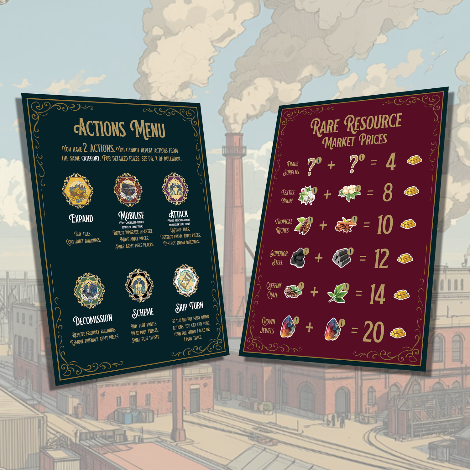 Each round unfolds across a dynamic hex-based map, where players buy land, construct forts and railways, mobilise armies, and interfere in their rivals’ plans. Income is shaped by a shared dice-driven economy, while 'Plot Twist' cards and 'Rare Resources' introduce sharp tactical swings, deal-making, and moments of brinkmanship.